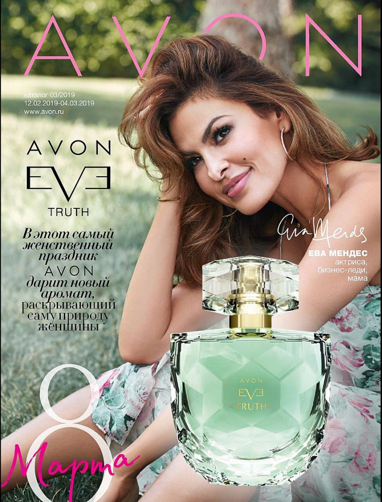 Каталог AVON 3 2019 традиционно посвящен 8 марта! И к этому женскому празднику AVON приготовил новый аромат Eve Truth, который представляет Ева Мендес. Ты всегда в круговороте дел и стремишься во всем быть успешной. Но правда в том, что ты - женщина. И бывает, все что тебе нужно, - это простые маленькие радости и... восхитительный цветочно-древесный аромат Avon Eve Truth! (стр. 5).